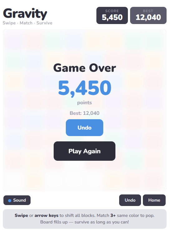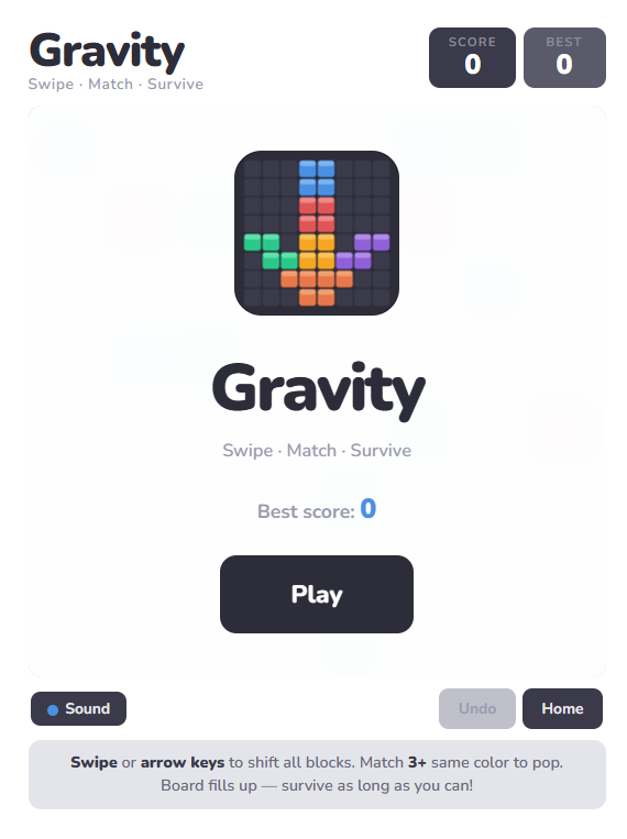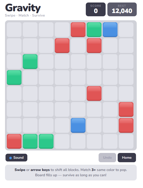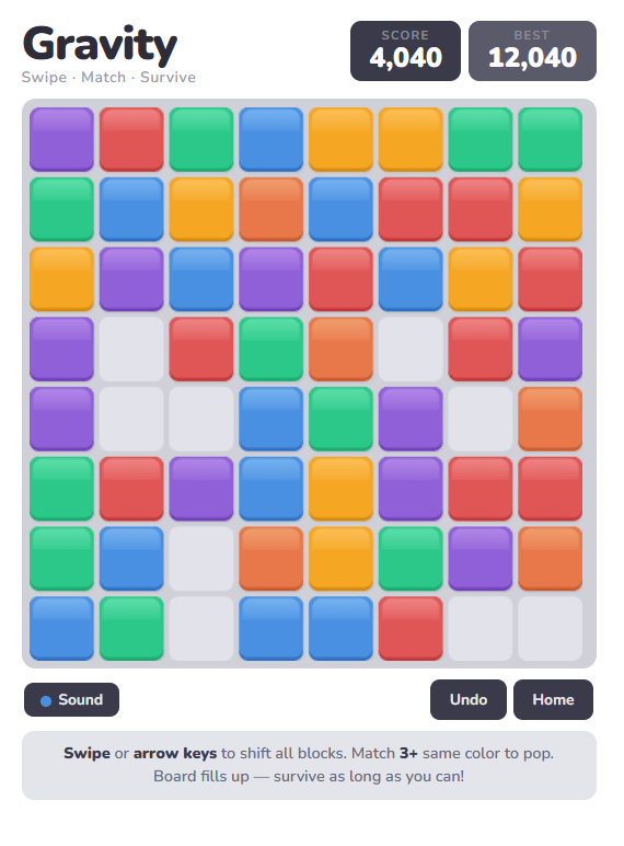 Swipe in any direction and every block on the board slides that way. When 3 or more same-colored blocks connect, they pop. Sounds simple — until new blocks keep appearing after every move and the board starts filling up.